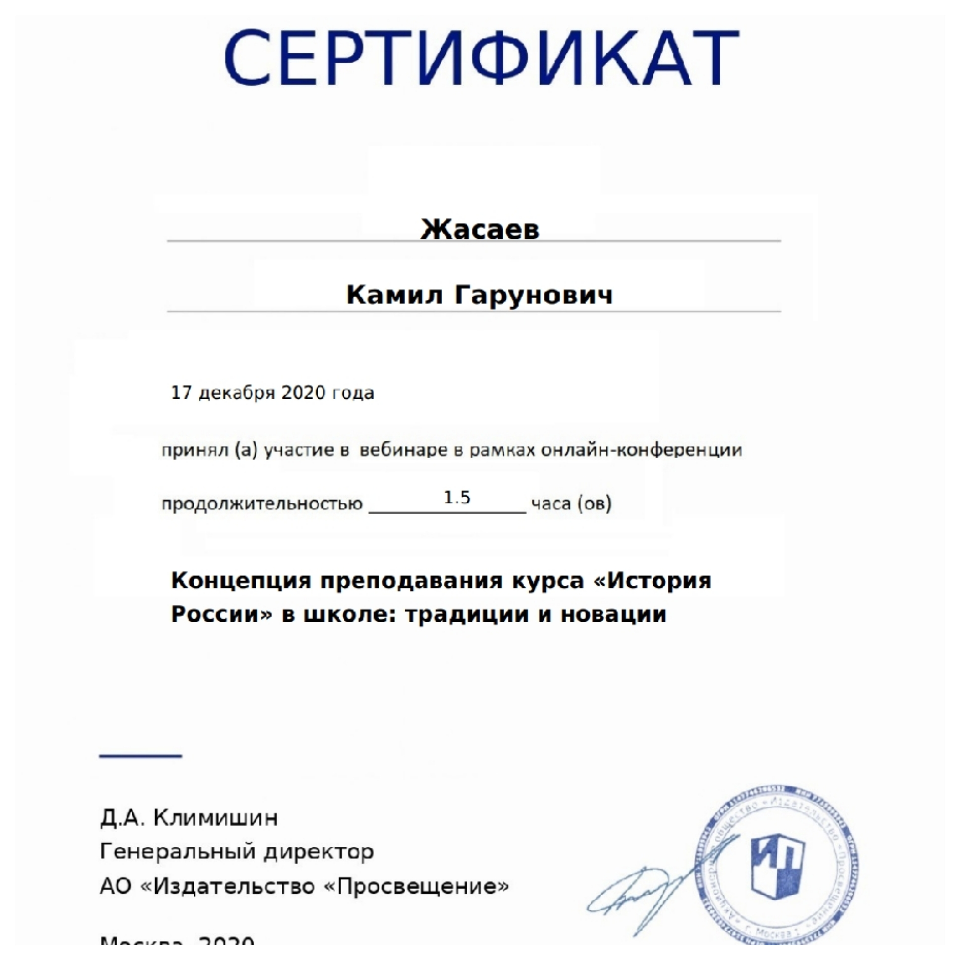 Учитель истории и обществознания Жасаев К.Г., принял участие в вебинаре в рамках онлайн-конференции. Концепция преподования курса "История России" в школе: традиции и новации.